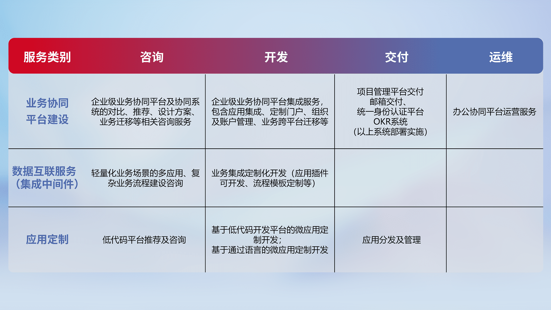 针对钉钉、、、企微、、IDaas等平台级产品提供产品的规划、、方案、、、交付、、、定制化开发等服务,,实现如统一协同办公、、智能客户服务、、、、混合会议管理、、、智能数据查询、、、、等业务场景,,,实现数字化转型。。。。
